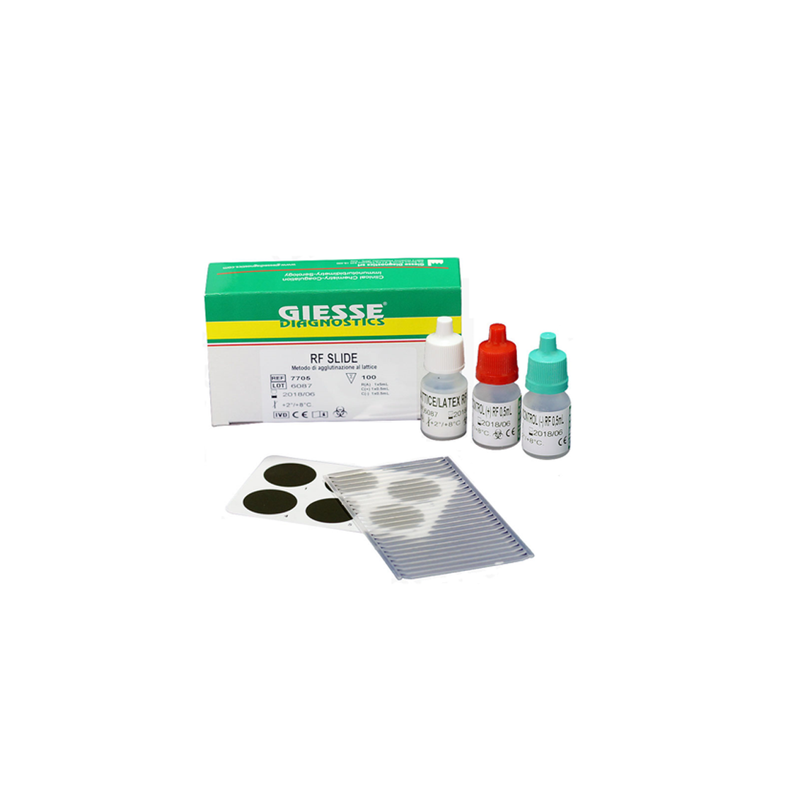 Nombre: RF SLIDE CON CONTROLES, KIT x 100 DETERMINACIONES. Marca: GIESSE DIAGNOSTICS Código de producto: 7705-RF